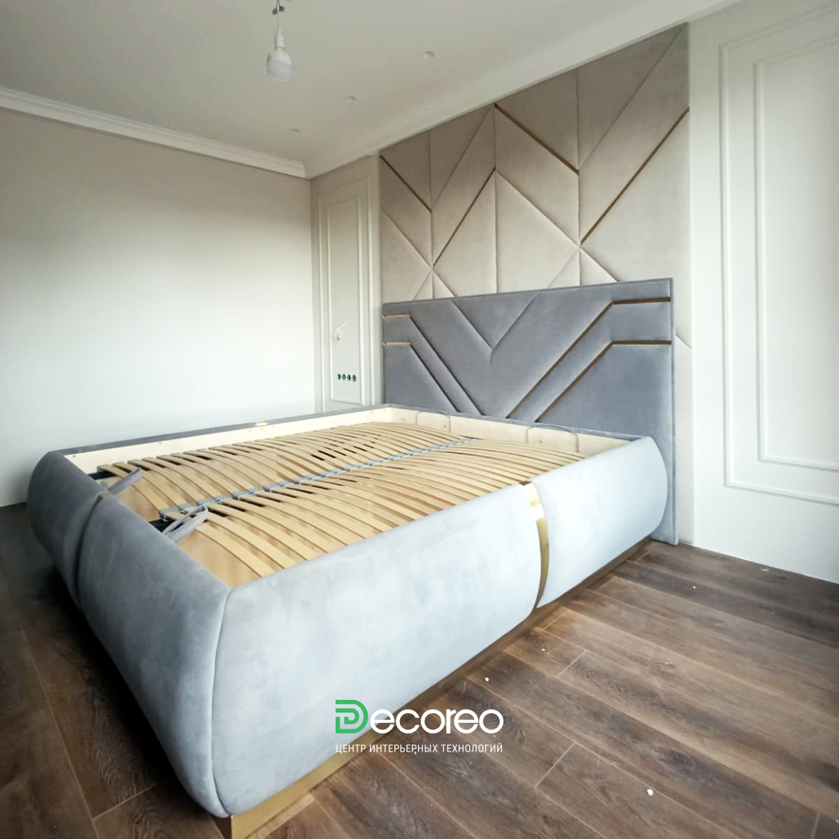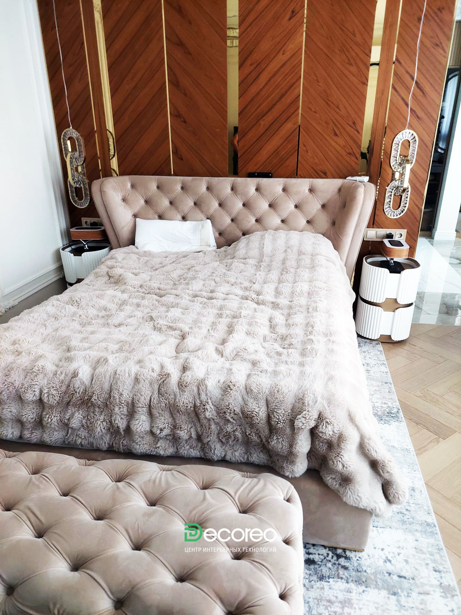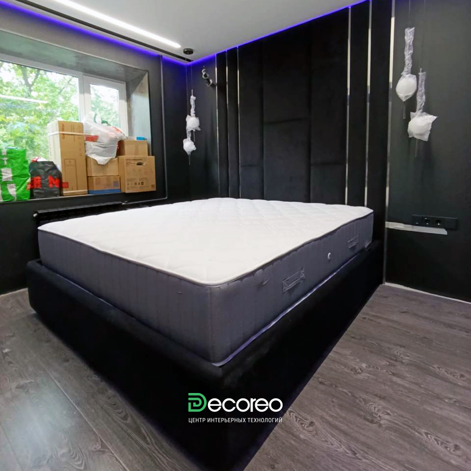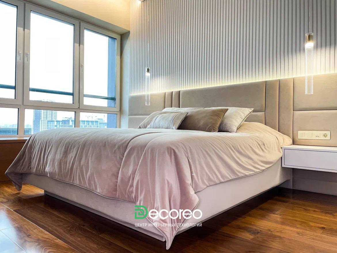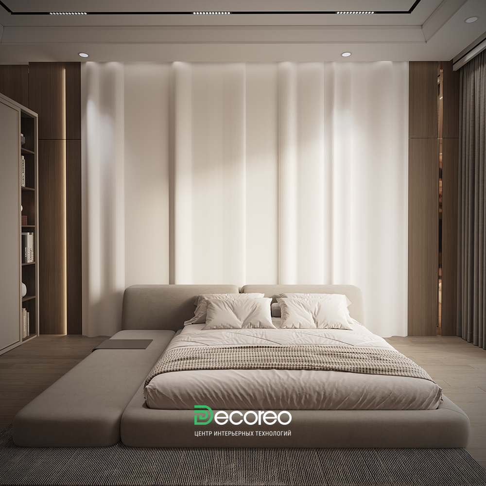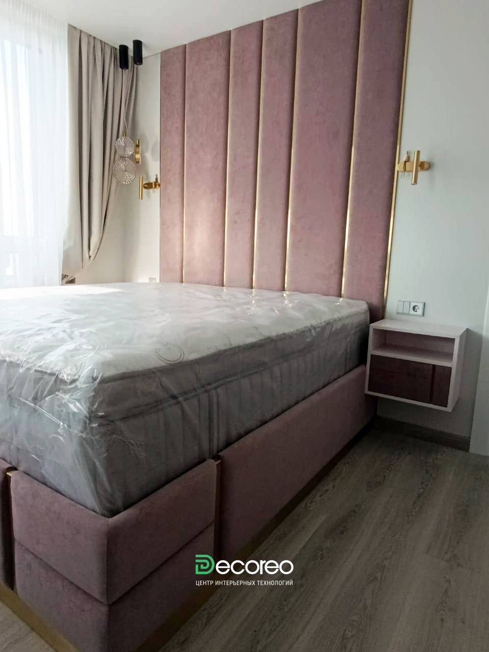 Мы создали современный интерьер, где каждая комната сочетается в одном стиле и цветовой гамме, используя ритмические элементы, такие как рейки у кроватей, в зоне телевизора, в шкафу и на тумбе. Стены декорированы различными материалами, такими как 3D-панели, мягкие панели и дерево, которые гармонично дополняют друг друга. Особый уют интерьеру придают мягкие кровати, выполненные по индивидуальному заказу.